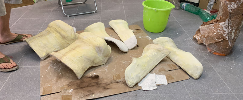 Sono stati creati su misura, adattandoli alle misure corporee dell'attrice in modo impeccabile. Abbiamo utilizzato bende gessate e rinforzi in stoffa, gommapiuma, viti ed elastici per la realizzazione.